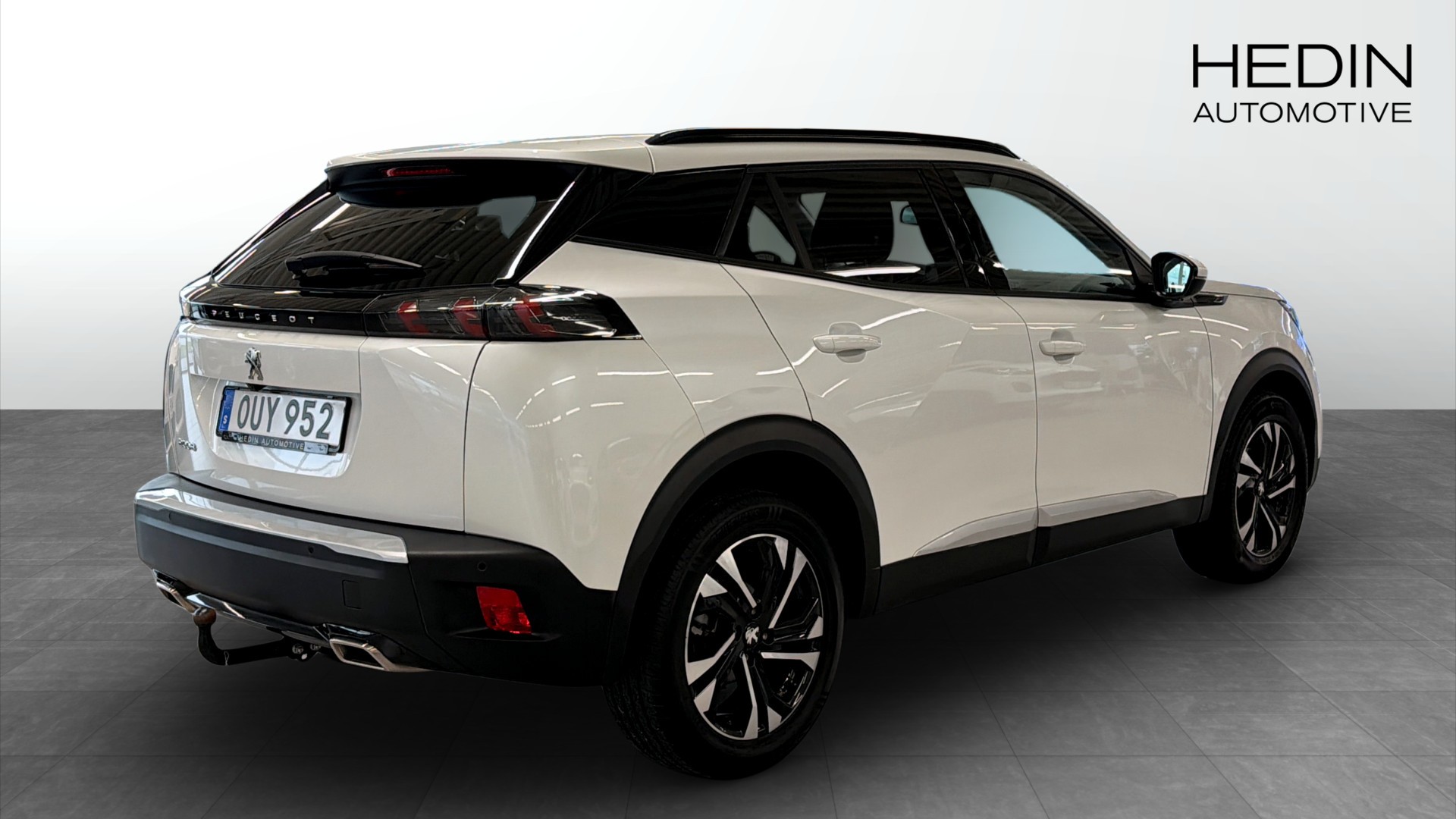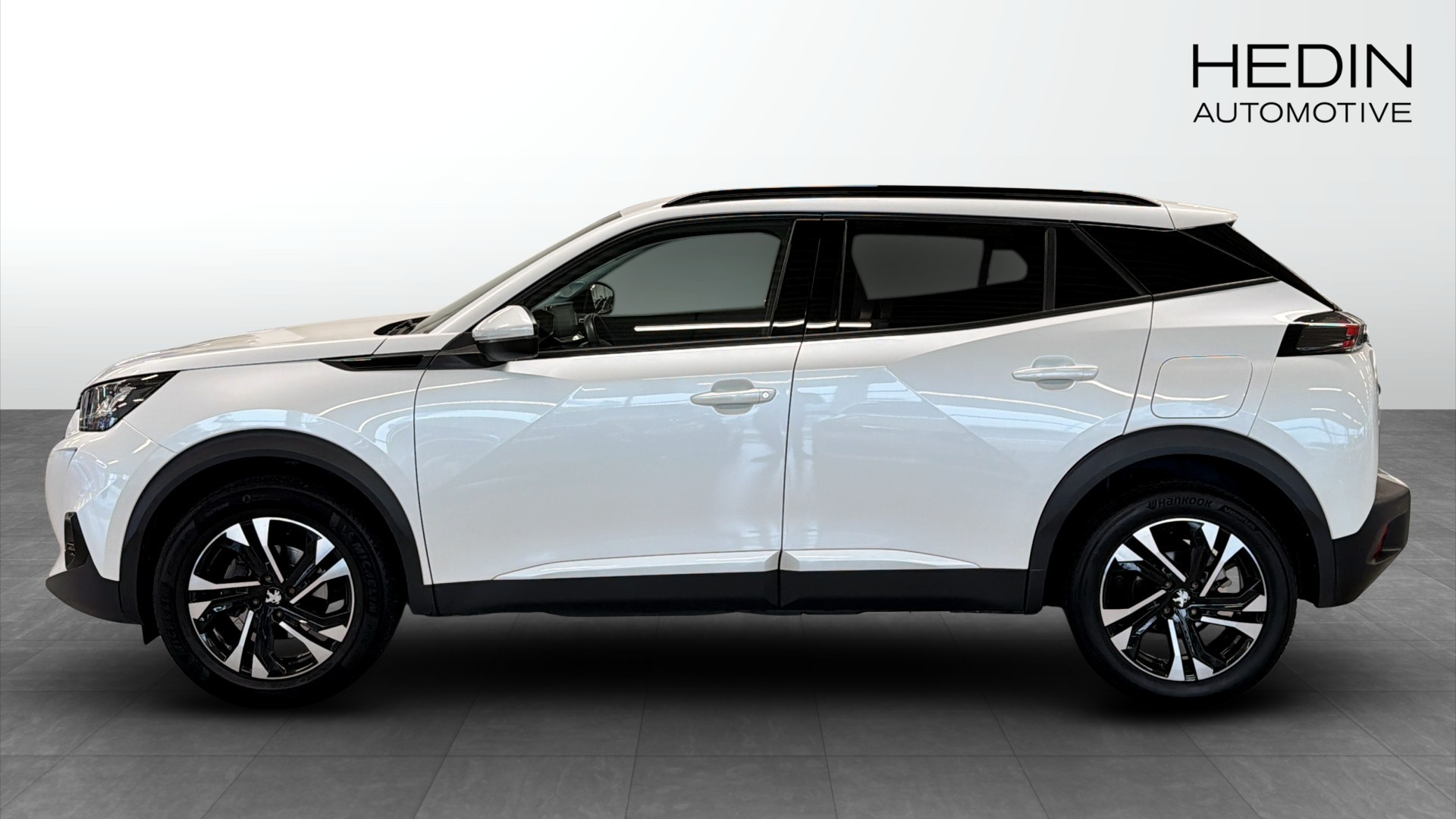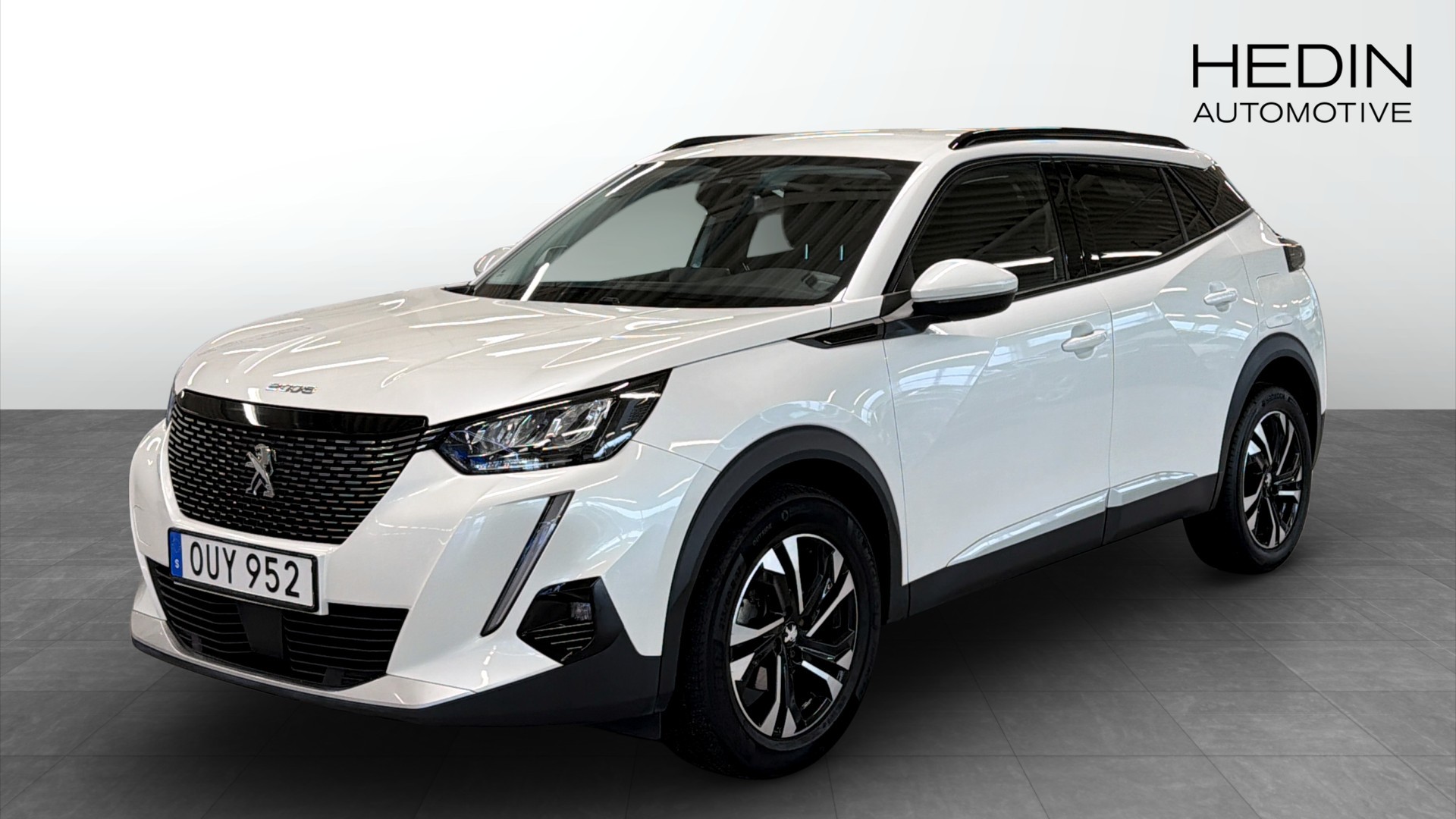 Peugeot 2008 1.2 PureTech 130 EAT, årsmodell 2021, i stilren vit kulör. En modern och lättkörd crossover med automatlåda, pigga 131 hk och låg förbrukning på endast 0,6 l/mil enligt WLTP.