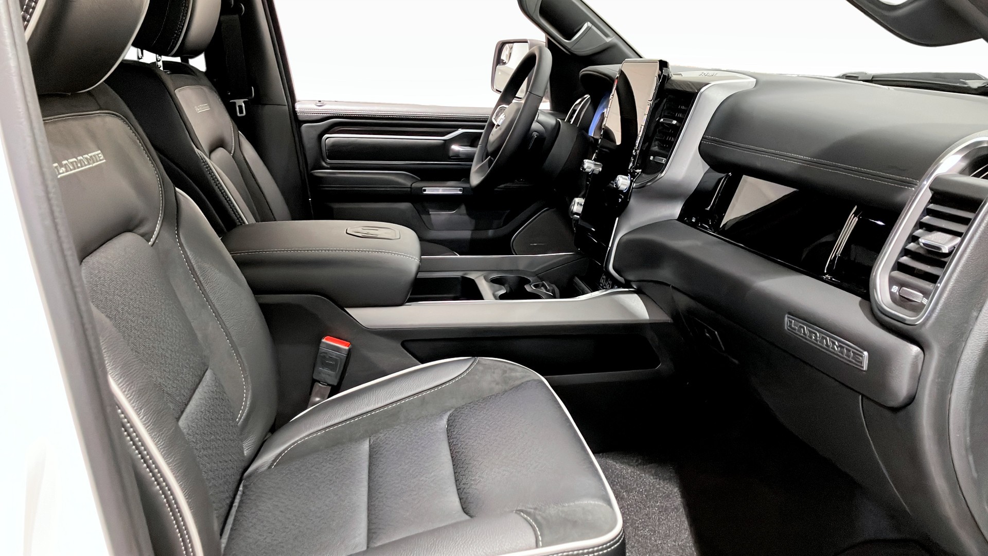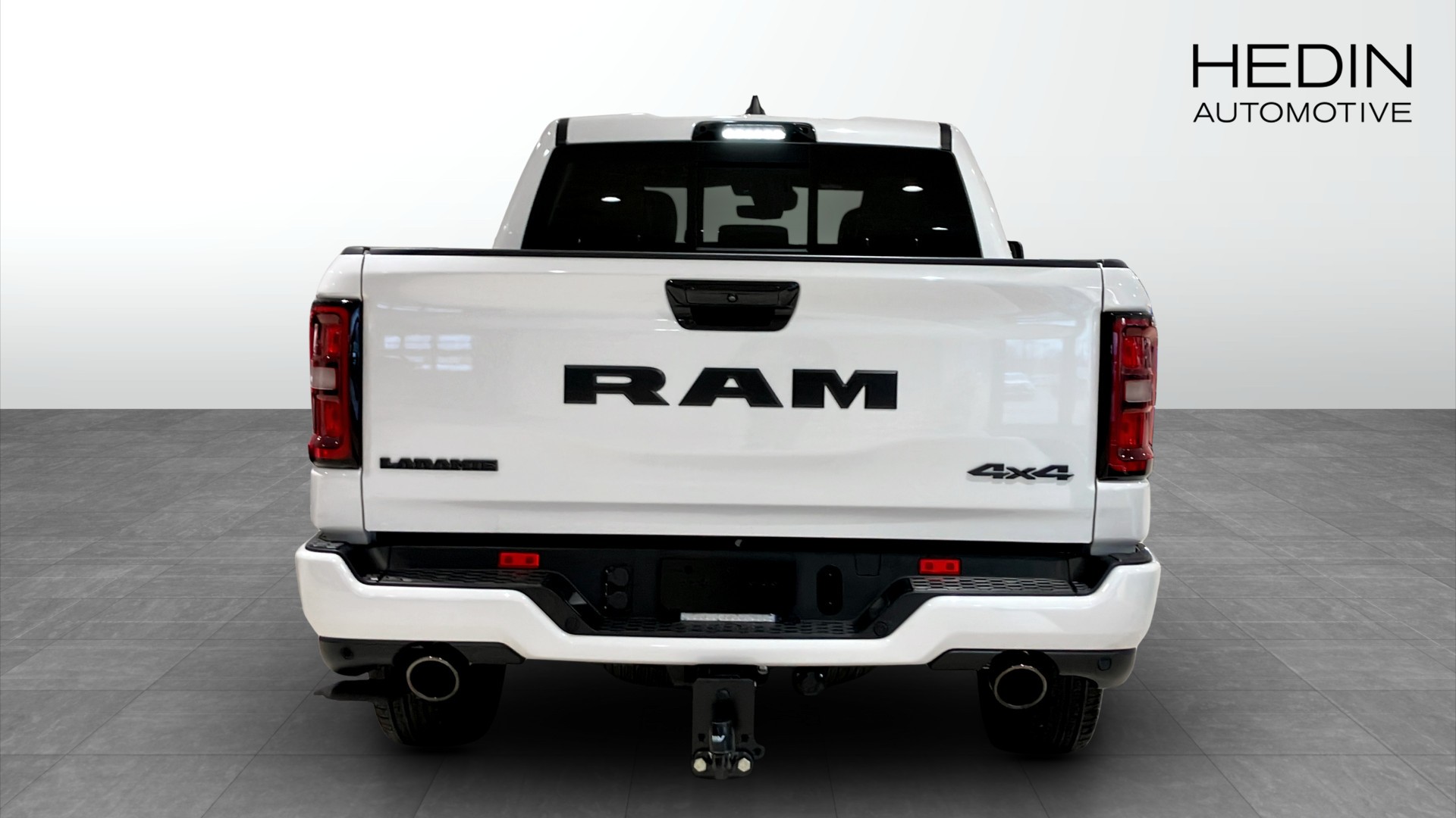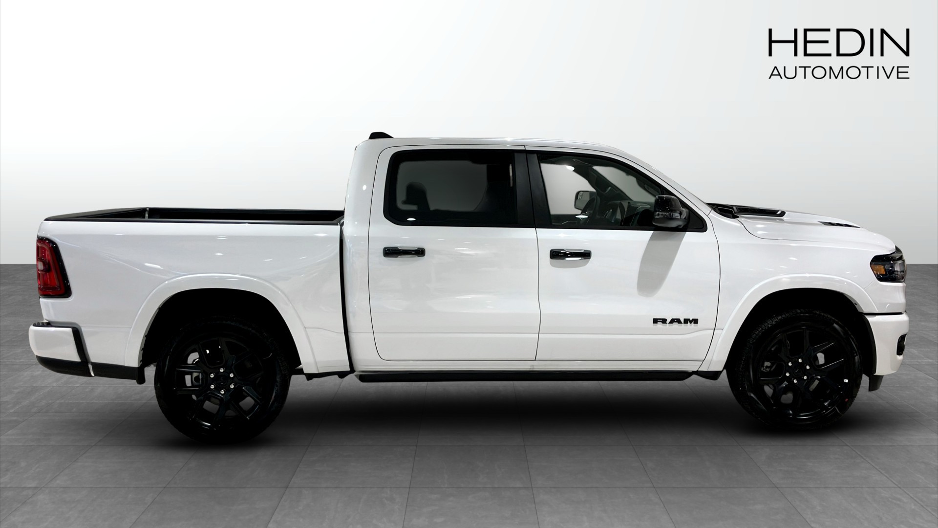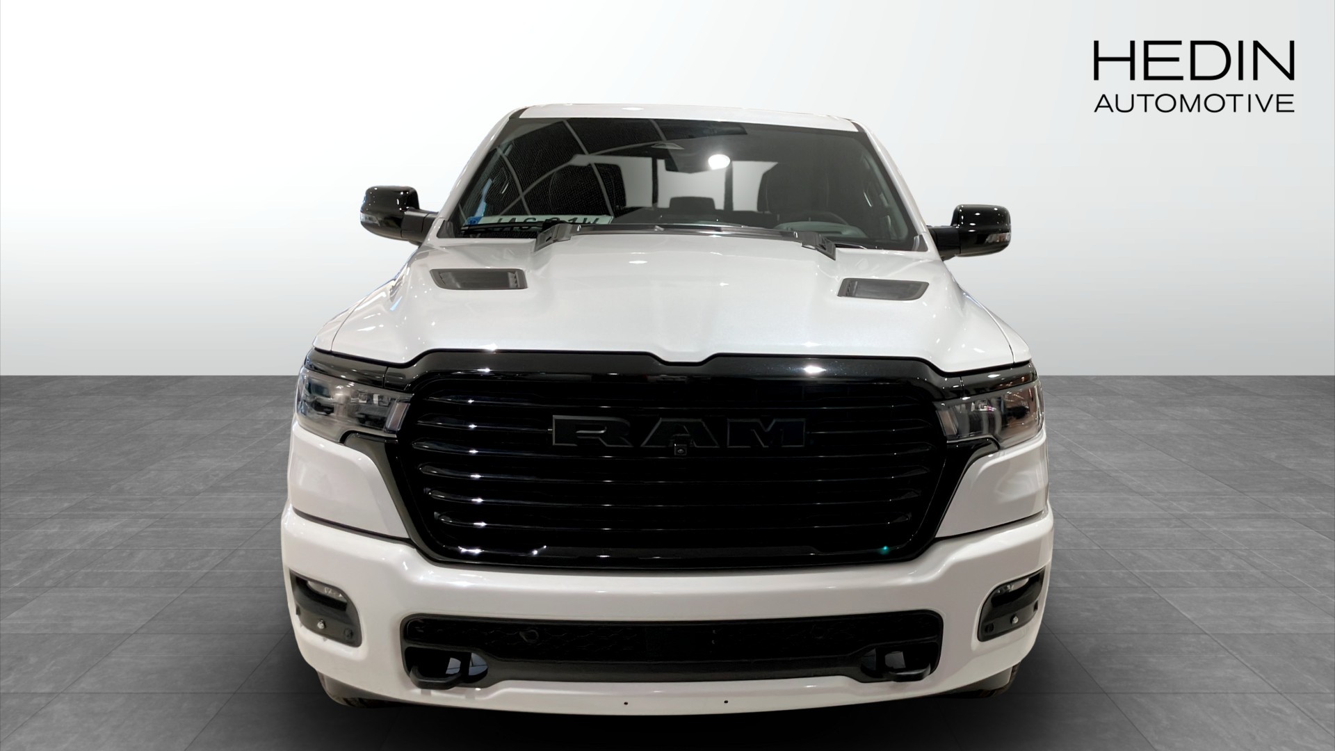 RAM 1500 Laramie Crew Cab årsmodell 2025 i vit kulör – en kraftfull och välutrustad pickup för dig som vill ha både arbetskapacitet och hög komfort.