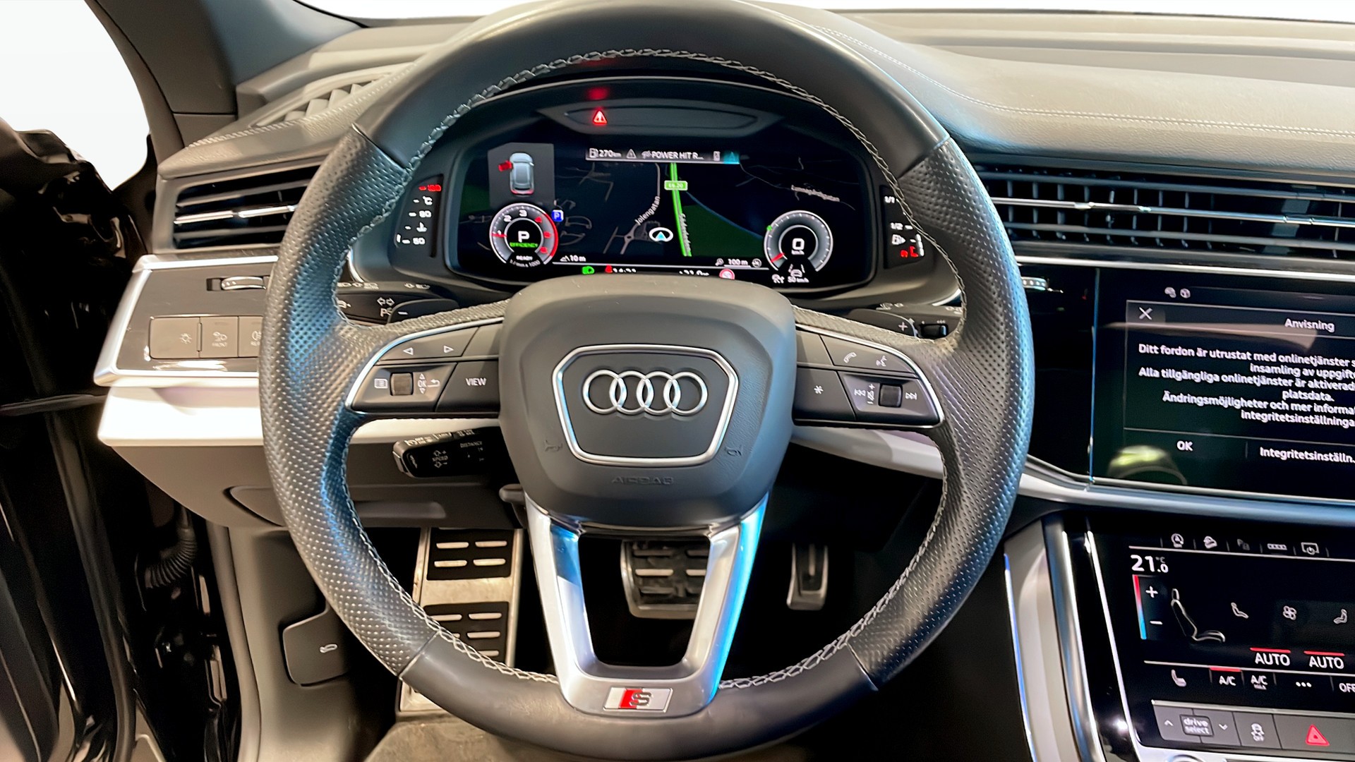Bilen har gått 815 mil och bjuder på en mycket attraktiv specifikation med bland annat öppningsbart panoramaglastak, Bang & Olufsen premium sound, Matrix LED-strålkastare, Valcona läderklädsel, el-drag, 22" Audi Sport-fälgar och svart optikpaket. Här får du dessutom S-Line sportpaket, el-framsäten med minnesfunktion för föraren, komfortnyckel, parkeringsassistent plus och 4-zons klimatanläggning.