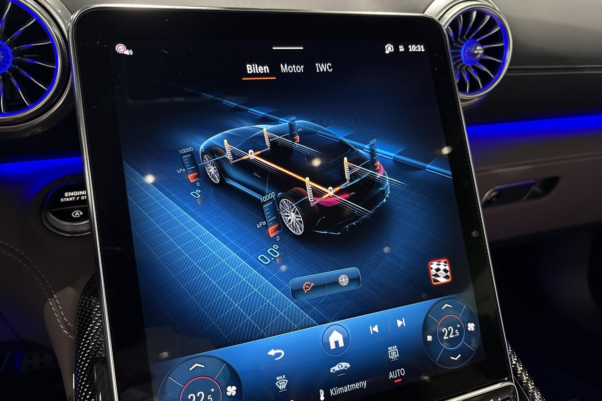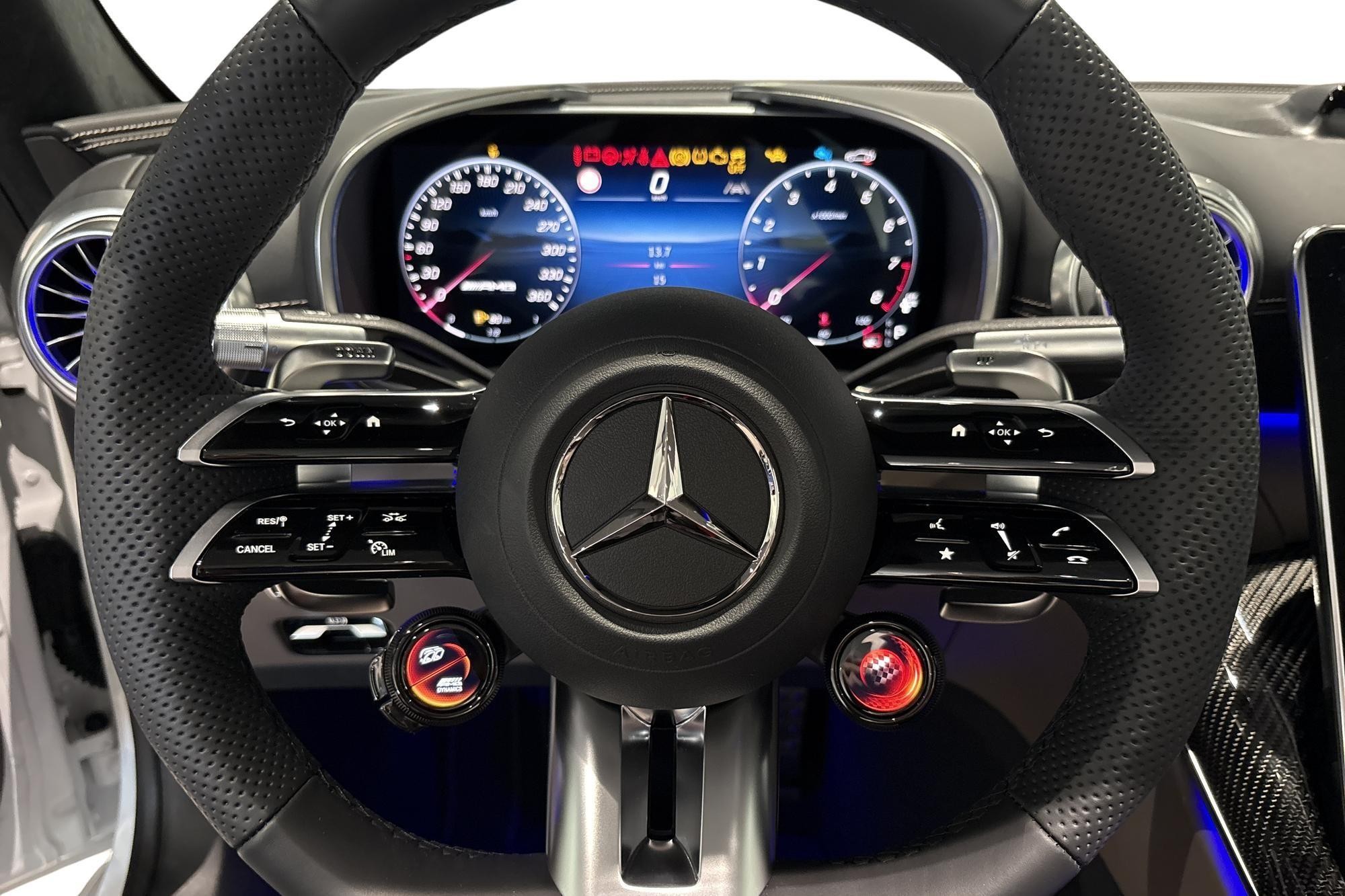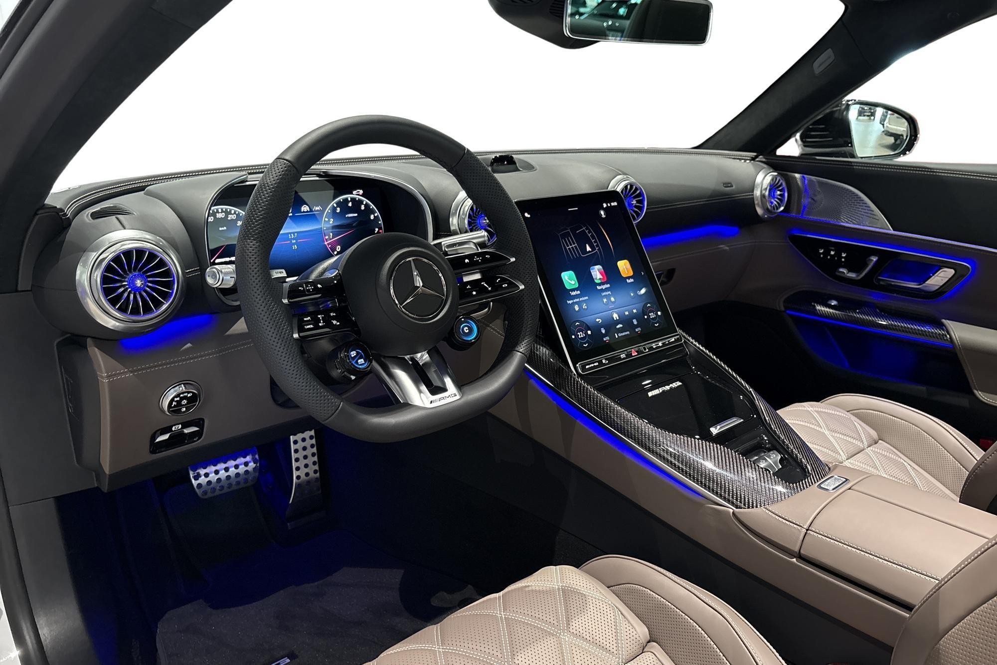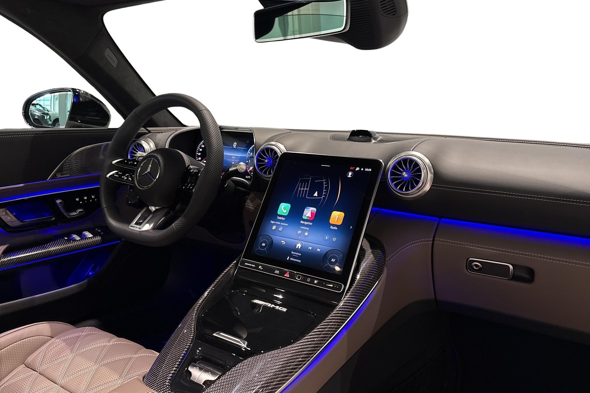 Invändigt möts du av en lyxig kupé med nappaläder i tryffelbrun/svart, AMG kolfiberpaneler och AMG Performance-stolar med minnespaket. Premiumpaket Plus, Burmester surroundsystem, MBUX med Augmented Reality, Apple CarPlay/Android Auto och Head-Up Display ger modern teknik, komfort och ljud i toppklass.
