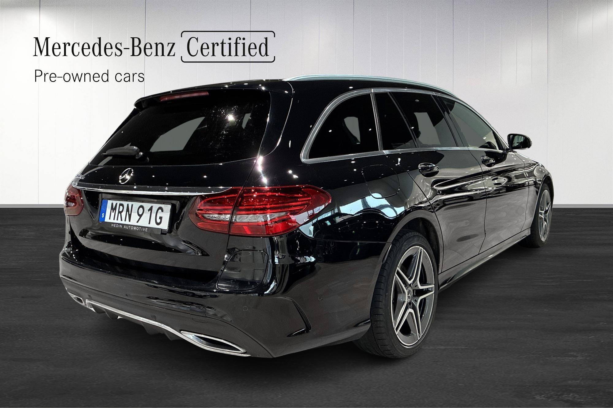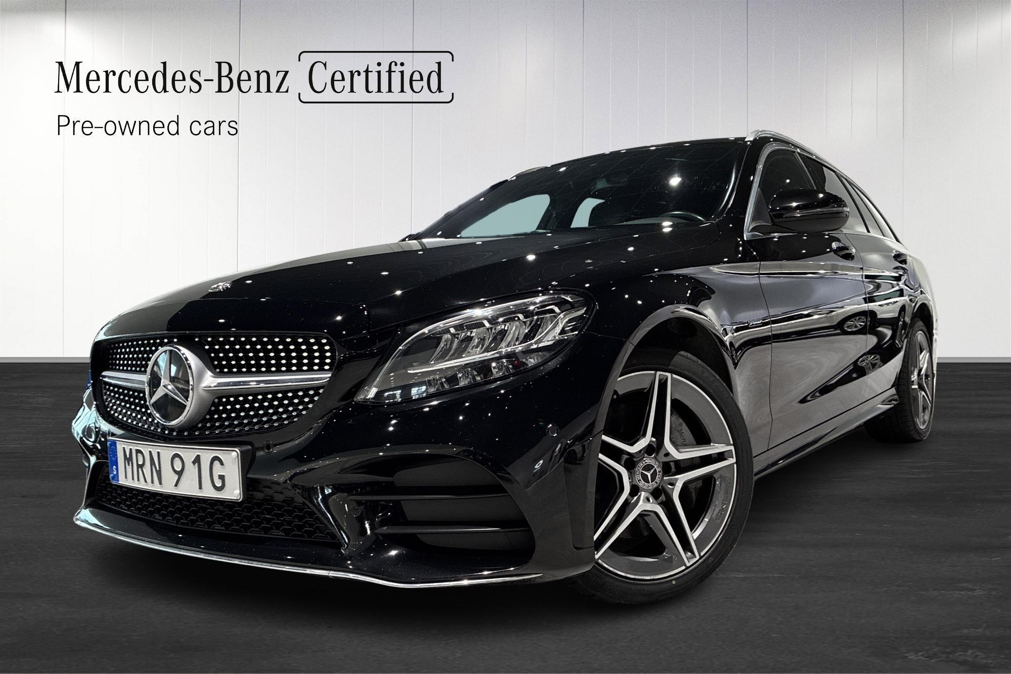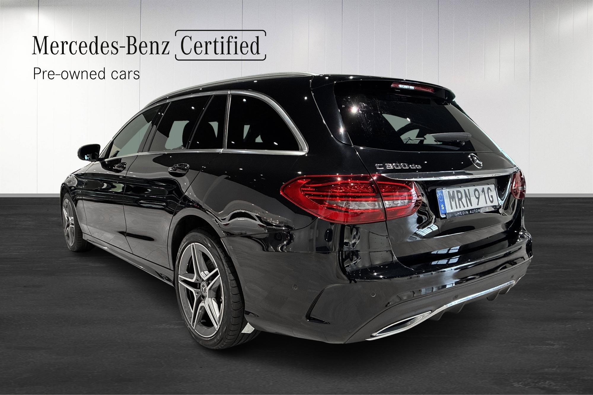 Mercedes-Benz C 300 de Kombi från 2020 i svart – en stilren och välutrustad laddhybrid som kombinerar premiumkänsla, dieselns räckvidd och eldriftens effektivitet. Bilen har gått 11 457 mil och erbjuder en komfortabel och smidig körupplevelse med automatväxellåda.