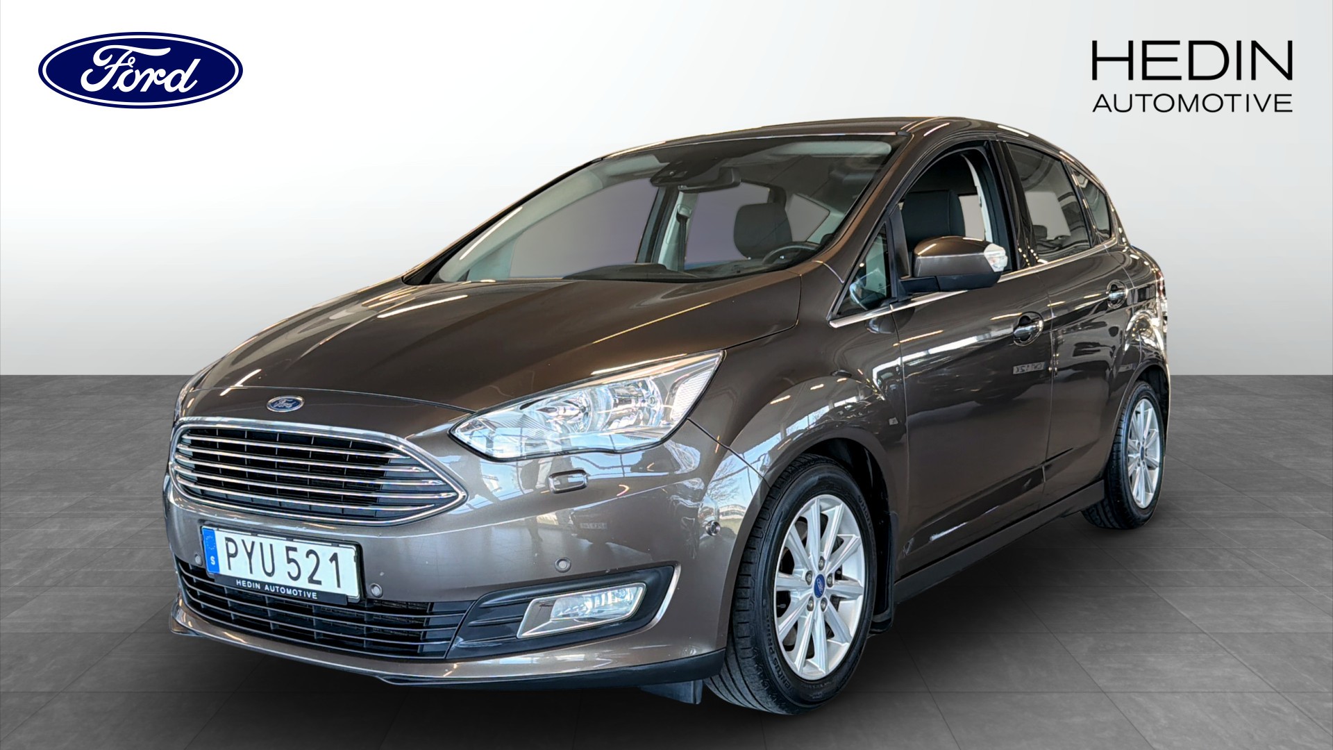 Ford C-Max 1.5 EcoBoost SelectShift Titanium, årsmodell 2016, i stilren grå kulör. En rymlig och praktisk familjebil med automatlåda, bensinmotor på 150 hk och framhjulsdrift som ger en smidig och bekväm körupplevelse.