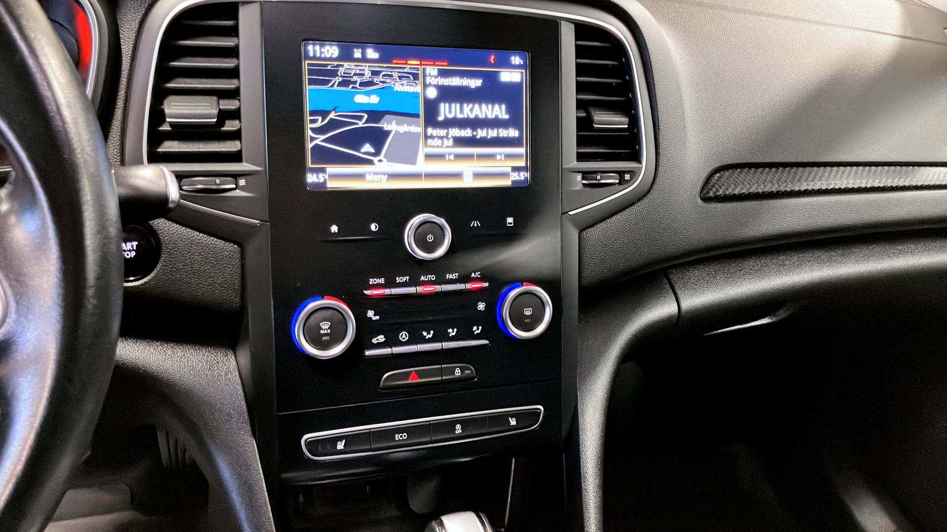 Invändigt möts du av svart textilklädsel, tvåzons klimatanläggning och keyless entry/go. Navigation hjälper dig rätt på resan och parkeringssensorer fram och bak gör parkeringen smidig. Bilen är dessutom utrustad med dragkrok, backstartshjälp, eco-läge, filbytesvarning, infällbara elspeglar samt både sommar- och vinterhjul.
